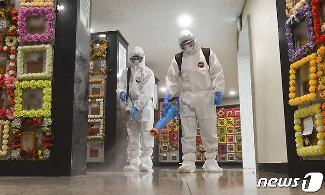 (수원=뉴스1) 김영운 기자 = 14일 오전 경기도 수원시 영통구 수원시연화장 추모의집에서 수원도시공사 직원들이 방역 작업을 하고 있다. 수원시연화장은 9월 6일부터 10월 10일까지 사전 예약제로 추모객들을 받으며 미예약자들은 입장 가능 인원수에 따라 입장에 제한이 있을 수 있다. 2021.9.14/뉴스1