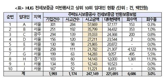 특히 가장 많은 전세보증금을 떼먹은 임대인은 2016년 9월부터 세입자의 보증금을 이용한 갭투기를 통해 2020년 기준 477채의 등록임대주택을 매입한 A씨다. 그는 올해 8월까지 총 284가구의 보증금 576억 6900만원을 돌려주지 않았다. HUG의 회수 금액은 1억5300만원으로 고작 0.3%에 그쳤다.