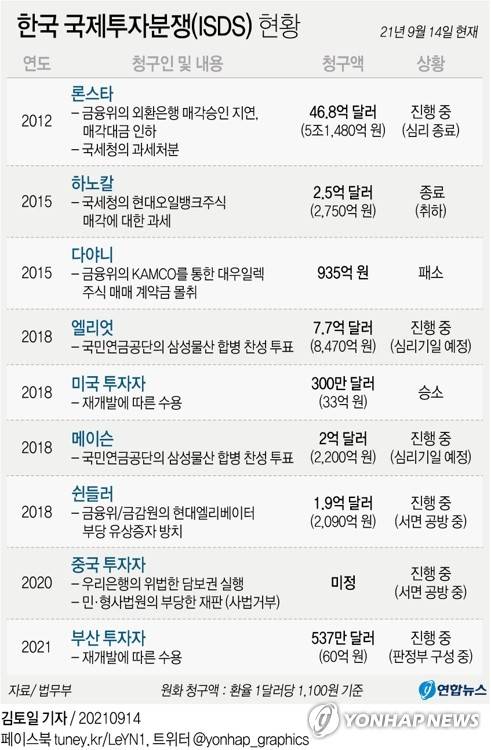 (서울=연합뉴스) 김토일 기자 = 14일 법무부에 따르면 지금까지 한국 정부를 상대로 제기된 ISDS 사건은 총 9건이다.