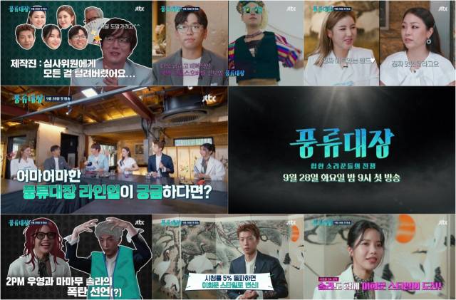 14일 JTBC 예능프로그램 ‘풍류대장-힙한 소리꾼들의 전쟁’(이하 ‘풍류대장’) 측은 제작진과 심사위원들의 모습이 담긴 티저 영상 2종을 공개했다. 심사위원들의 파격적인 시청률 공약과 함께 실력파 참가자들의 모습이 예고돼 눈길을 끌었다.