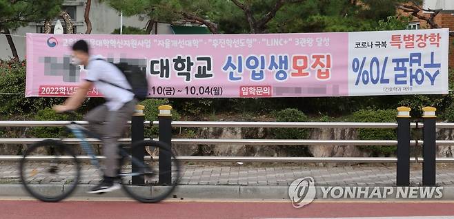 (상주=연합뉴스) 이진욱 기자 = 14일 경북 상주시내에 경북 한 대학 수시모집 안내 현수막이 걸려 있다. 이 학교는 간호학과를 제외한 경북,충북, 강원 지역 학생들에게 입학학기 수업료 70%를 장학금으로 지급하고 원거리 학생들에게 기숙사비를 1년간 지원한다. 최근 학령인구 감소로 지방 소재 대학들은 신입생 확보에 안간힘을 쓰고 있다. 한편 대부분의 대학은 이날 2022학년도 수시 원서접수를 마감할 예정이다. 2021.9.14