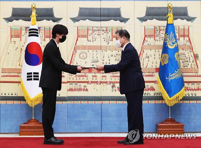 (서울=연합뉴스) 최재구 기자 = 문재인 대통령이 14일 청와대에서 열린 미래세대와 문화를 위한 대통령 특별사절 임명장 수여식에서 그룹 BTS 멤버 진에게 임명장을 수여하고 있다. 2021.9.14