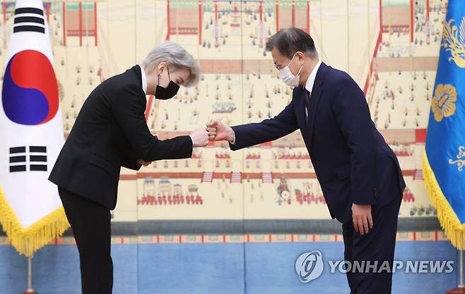 (서울=연합뉴스) 최재구 기자 = 문재인 대통령이 14일 청와대에서 열린 미래세대와 문화를 위한 대통령 특별사절 임명장 수여식에서 그룹 BTS 멤버 슈가에게 임명장을 수여하고 주먹인사를 하고 있다. 2021.9.14