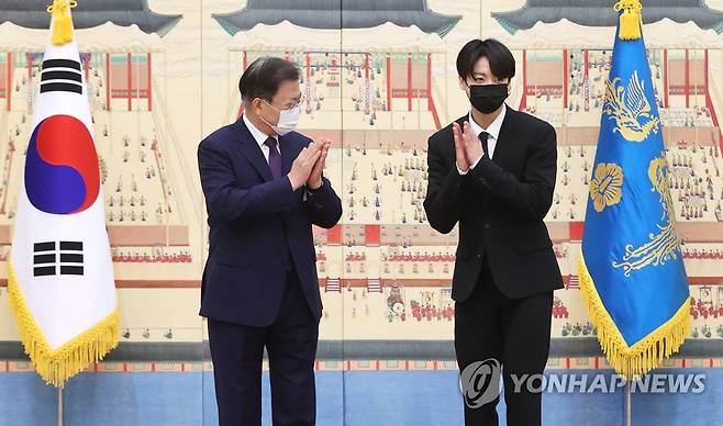 (서울=연합뉴스) 최재구 기자 = 문재인 대통령이 14일 청와대에서 열린 미래세대와 문화를 위한 대통령 특별사절 임명장 수여식에서 그룹 BTS 멤버 정국과 사진촬영을 마치고 인사하고 있다. 2021.9.14