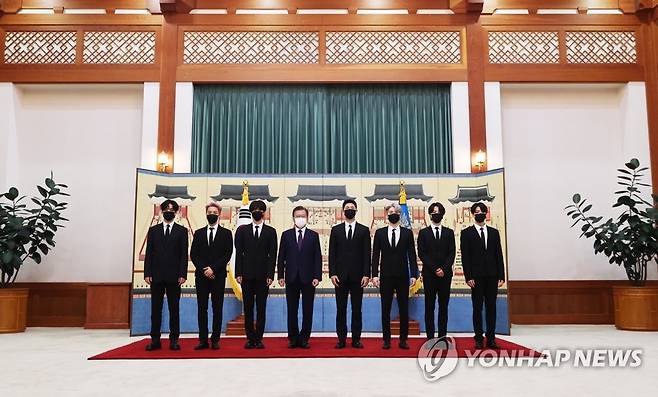 (서울=연합뉴스) 최재구 기자 = 문재인 대통령이 14일 청와대에서 열린 미래세대와 문화를 위한 대통령 특별사절 임명장 수여식에서 그룹 BTS에게 임명장을 수여하고 기념사진을 촬영하고 있다. 왼쪽부터 뷔, 제이홉, 진, 문 대통령, RM, 슈가, 지민, 정국. 2021.9.14