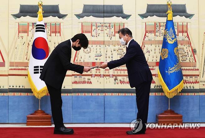 (서울=연합뉴스) 최재구 기자 = 문재인 대통령이 14일 청와대에서 열린 미래세대와 문화를 위한 대통령 특별사절 임명장 수여식에서 그룹 BTS 멤버 뷔에게 임명장을 수여하고 있다. 2021.9.14