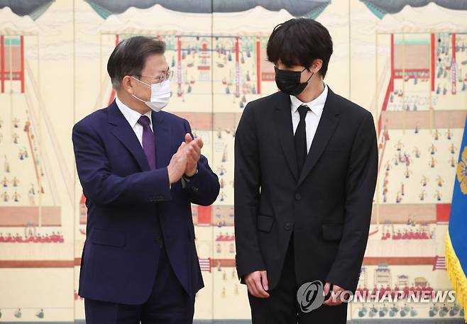 (서울=연합뉴스) 최재구 기자 = 문재인 대통령이 14일 청와대에서 열린 미래세대와 문화를 위한 대통령 특별사절 임명장 수여식에서 그룹 BTS 멤버 진과 사진촬영을 마치고 인사하고 있다. 2021.9.14