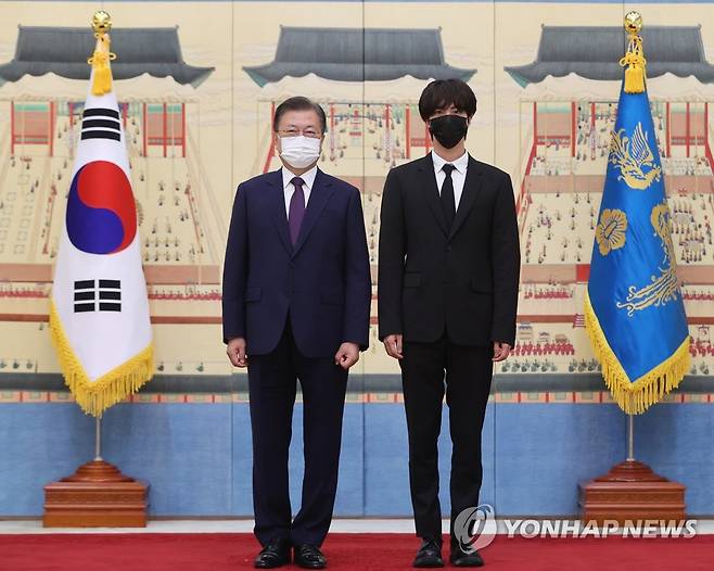 (서울=연합뉴스) 최재구 기자 = 문재인 대통령이 14일 청와대에서 열린 미래세대와 문화를 위한 대통령 특별사절 임명장 수여식에서 그룹 BTS 멤버 진에게 임명장을 수여하고 기념사진을 촬영하고 있다. 2021.9.14