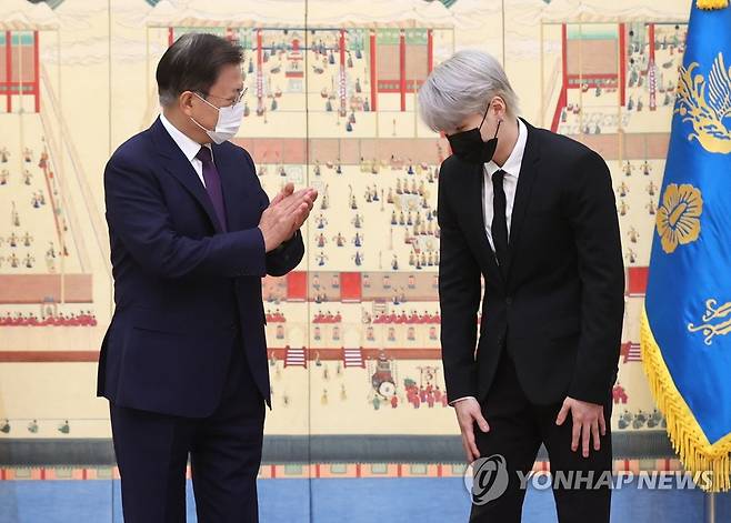 (서울=연합뉴스) 최재구 기자 = 문재인 대통령이 14일 청와대에서 열린 미래세대와 문화를 위한 대통령 특별사절 임명장 수여식에서 그룹 BTS 멤버 슈가와 사진촬영을 마치고 인사하고 있다. 2021.9.14