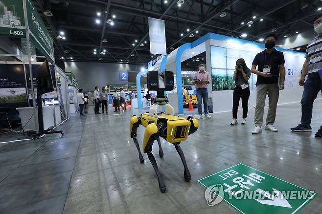 (고양=연합뉴스) 김병만 기자 = 14일 경기도 고양시 일산 킨텍스에서 열린 '2021 InQuE 한국건설안전박람회'에서 한 업체의 레이저 스캐너를 탑재한 4족 보행로봇 스팟이 전시장을 누비고 있다. 이 업체 관계자는 이러한 첨단장비는 터널 시공, 화학 공장, 원자력 시설 등 사람의 접근이 어려운 위험 지역을 3차원으로 측정해 시설물의 검사 및 유지 관리할 수 있다고 밝혔다.