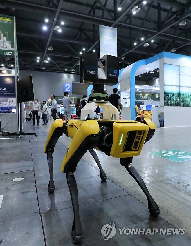 (고양=연합뉴스) 김병만 기자 = 14일 경기도 고양시 일산 킨텍스에서 열린 '2021 InQuE 한국건설안전박람회'에서 한 업체의 레이저 스캐너를 탑재한 4족 보행로봇 스팟이 전시장을 누비고 있다. 이 업체 관계자는 이러한 첨단장비는 터널 시공, 화학 공장, 원자력 시설 등 사람의 접근이 어려운 위험 지역을 3차원으로 측정해 시설물의 검사 및 유지 관리할 수 있다고 밝혔다.
