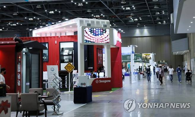 (고양=연합뉴스) 김병만 기자 = 14일 경기도 고양시 일산 킨텍스에서 열린 '2021 InQuE 한국건설안전박람회'에서 참관객들이 전시장을 둘러보고 있다.