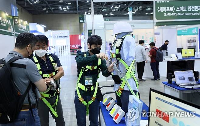 (고양=연합뉴스) 김병만 기자 = 14일 경기도 고양시 일산 킨텍스에서 열린 '2021 InQuE 한국건설안전박람회'에서 참관객들이 각 부스를 둘러보고 있다.