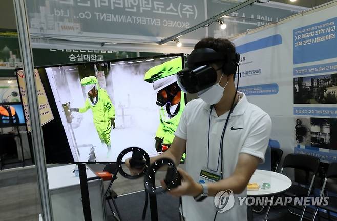 (고양=연합뉴스) 김병만 기자 = 14일 경기도 고양시 일산 킨텍스에서 열린 '2021 InQuE 한국건설안전박람회'에서 한 업체의 연구원이 VR기기를 착용하고 화학물질 유출사고 대비 훈련 모습을 보여주고 있다.