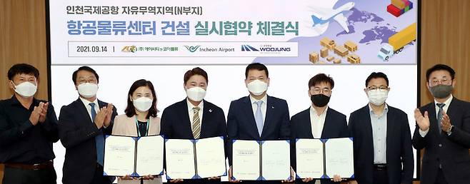 [인천공항=뉴시스] 홍찬선 기자 = 인천공항공사는 14일 인천 중구 공사 회의실에서 ㈜에이씨티앤코아물류, 우정항공과 '인천공항 자유무역지역 제1공항물류단지 개발을 위한 실시협약'을 체결했다고 밝혔다. 이번 협약 체결 대상 지역은 인천공항 제1공항물류단지의 N1,N2 필지로 에이씨티앤코아물류(N1)와 우정항공(N2)은 오는 2022년 하반기 준공을 목표로 대형 물류센터를 건설할 예정이다. 사진은 이날 체결식에서 김경욱 공사 사장과 이희정 공사 미래사업본부장, 임준석 우정항공 대표이사, 김생영 에이씨티앤코아물류 전무 등 관계자들이 기념촬영을 하고 있다. (사진=인천공항공사 제공) 2021.09.14. photo@newsis.com