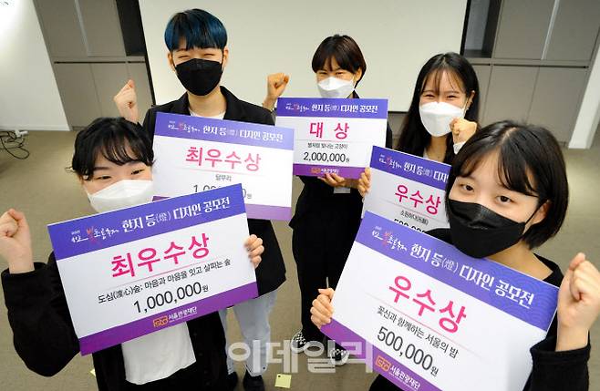[이데일리 김태형 기자] 14일 서울관광재단에서 열린 ‘2021 서울빛초롱축제 한지 등(燈) 디자인 공모전’ 시상식에서 수상자들이 기념촬영을 하고 있다.