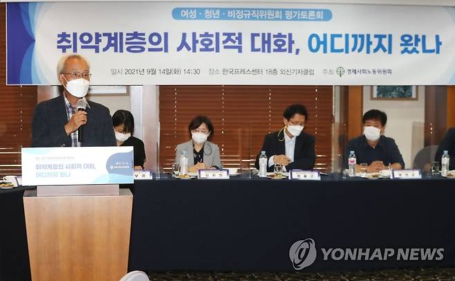 (서울=연합뉴스) 이정훈 기자 = 문성현 경제사회노동위원장이 14일 오후 서울 중구 한국프레스센터에서 열린 여성·청년·비정규직위원회 평가토론회 '취약계층의 사회적 대화, 어디까지 왔나'에서 개회사를 하고 있다. 2021.9.14