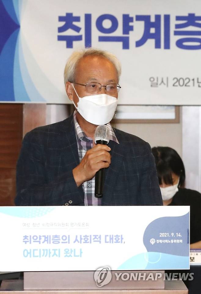 (서울=연합뉴스) 이정훈 기자 = 문성현 경제사회노동위원장이 14일 오후 서울 중구 한국프레스센터에서 열린 여성·청년·비정규직위원회 평가토론회 '취약계층의 사회적 대화, 어디까지 왔나'에서 개회사를 하고 있다. 2021.9.14