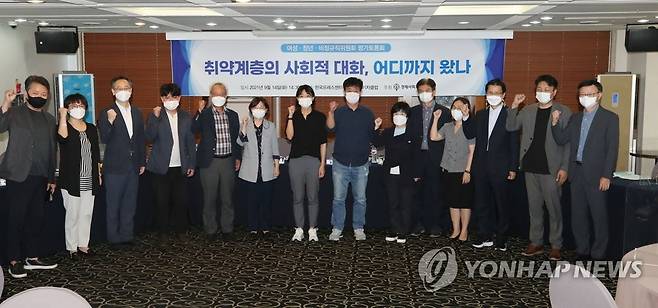 (서울=연합뉴스) 이정훈 기자 = 문성현 경제사회노동위원장(왼쪽 다섯번째)이 14일 오후 서울 중구 한국프레스센터에서 열린 여성·청년·비정규직위원회 평가토론회 '취약계층의 사회적 대화, 어디까지 왔나'에서 참석자들과 기념촬영을 하고 있다. 2021.9.14
