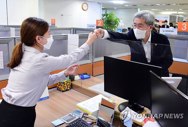 (서울=연합뉴스) 이정훈 기자 = 고승범 금융위원장이 14일 서울 중구 서민금융중앙통합지원센터를 찾아 직원을 격려하고 있다. 2021.9.14 [공동취재]