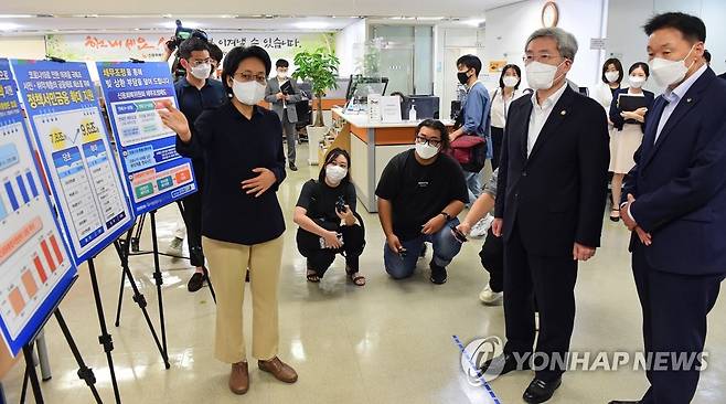 (서울=연합뉴스) 이정훈 기자 = 고승범 금융위원장이 14일 서울 중구 서민금융중앙통합지원센터를 찾아 업무보고를 받고 있다. 2021.9.14 [공동취재]