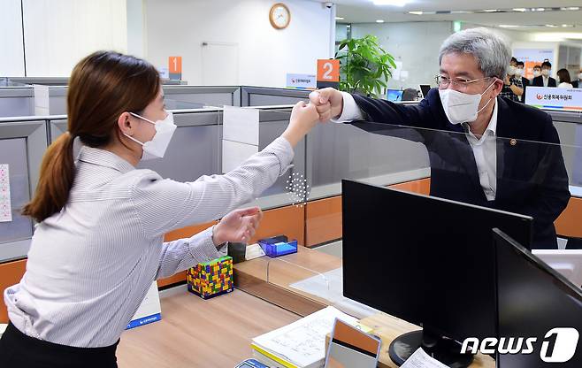(서울=뉴스1) 김명섭 기자 = 고승범 금융위원장이 14일 서울 중구 서민금융중앙통합지원센터에서 직원을 격려하고 있다. 2021.9.14/뉴스1