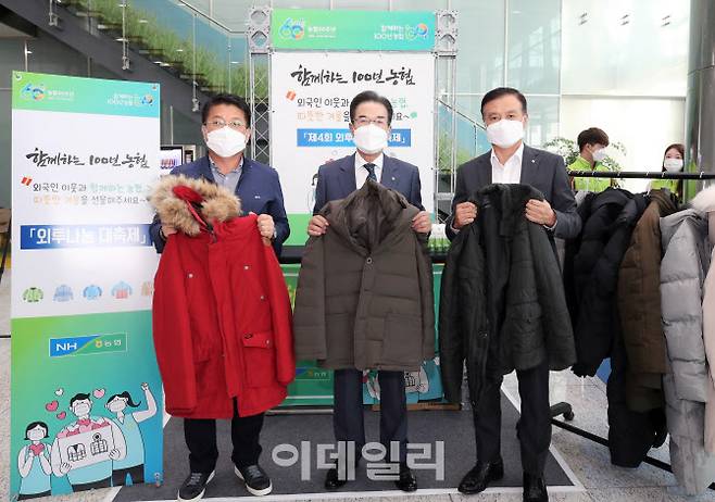[이데일리 김태형 기자] 이성희(가운데) 농협중앙회장이 14일 농협 본관에서 열린 '범농협 임직원 외투나눔'에서 금융노조 NH농협지부 김용택(왼쪽) 위원장(왼쪽), NH농협중앙회노동조합 김동혁(오른쪽) 위원장과 행사에 참여하고 있다.