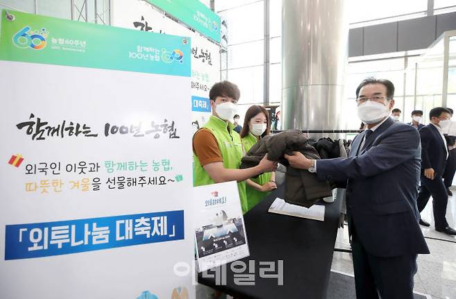 이번 행사는 겨울이 없는 나라에서 온 외국인 근로자들에게 외투를 기부하는 이웃사랑 행사로 농협 임직원들은 지난해에도 386벌의 외투를 기부했다.