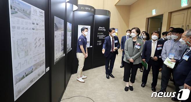 (세종=뉴스1) 장수영 기자 = 유은혜 사회부총리 겸 교육부 장관이 14일 세종시 어진동 세종컨벤션센터에서 열린 그린스마트 미래학교 가상설계 및 콘텐츠 공모전 시상식에서 수상작을 살펴보고 있다. 2021.9.14/뉴스1