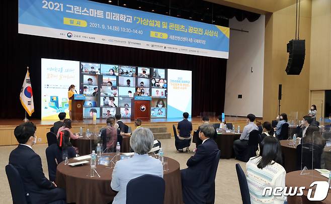 (세종=뉴스1) 장수영 기자 = 유은혜 사회부총리 겸 교육부 장관이 14일 세종시 어진동 세종컨벤션센터에서 열린 그린스마트 미래학교 가상설계 및 콘텐츠 공모전 시상식에서 격려사를 하고 있다. 2021.9.14/뉴스1