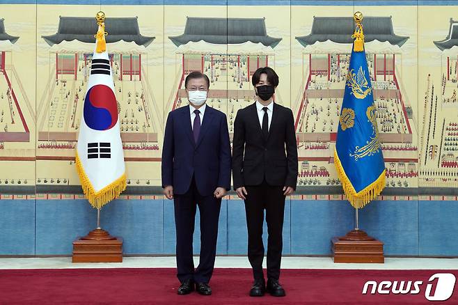 (서울=뉴스1) 유승관 기자 = 문재인 대통령이 14일 청와대에서 열린 미래세대와 문화를 위한 대통령 특별사절 임명장 수여식에서 아이돌 그룹 방탄소년단(BTS) 멤버 지민(박지민)에게 임명장을 수여하고 기념촬영을 하고 있다. 2021.914/뉴스1
