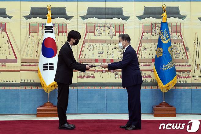 (서울=뉴스1) 유승관 기자 = 문재인 대통령이 14일 청와대에서 열린 미래세대와 문화를 위한 대통령 특별사절 임명장 수여식에서 아이돌 그룹 방탄소년단(BTS) 멤버 진(김석진))에게 임명장을 수여하고 외교여권과 기념품을 전달하고 있다. 2021.914/뉴스1