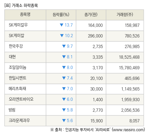 [fnRASSI]장마감, 거래소 하락 종목(SK케미칼우 -13.7% ↓)