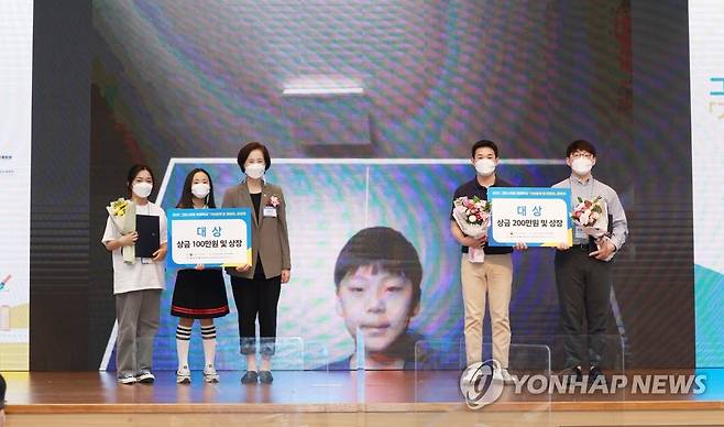 (서울=연합뉴스) 유은헤 사회부총리 겸 교육부 장관(왼쪽 세 번째)이 14일 오후 정부세종컨벤션센터에서 열린 2021 그린스마트 미래학교 가상설계 및 콘텐츠 공모전 시상식에서 수상자들과 기념 촬영을 하고 있다. 2021.9.14