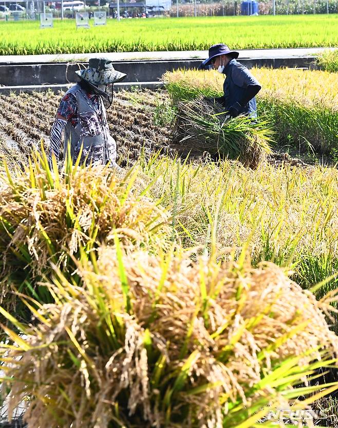 [수원=뉴시스] 김종택기자 = 청명한 날씨를 보인 14일 오후 경기도 수원시 농촌진흥청 국립식량과학원 작물연구동에서 관계자들이 누렇게 익은 벼를 수확하고 있다. 2021.09.14.