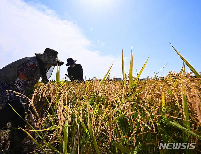 [수원=뉴시스] 김종택기자 = 청명한 날씨를 보인 14일 오후 경기도 수원시 농촌진흥청 국립식량과학원 작물연구동에서 관계자들이 누렇게 익은 벼를 수확하고 있다. 2021.09.14.
