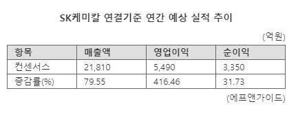 금융투자업체 에프앤가이드는 SK케미칼의 올해 연간 연결기준 예상 영업이익을 5490억원으로 전년 대비 416.46% 늘어날 것이라고 예상했다. 같은 기간 매출액은 2조1810억원으로 79.55% 급증할 전망이다.