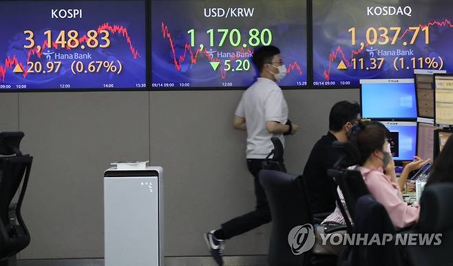 사진은 이날 명동 하나은행 본점 딜링룸 모습. 2021.9.14