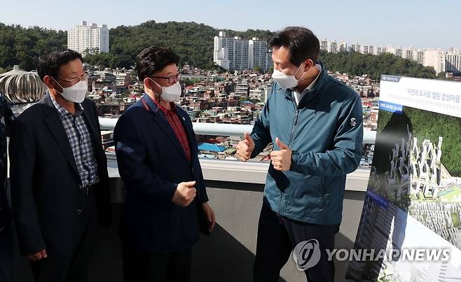 (서울=연합뉴스) 이지은 기자 = 오세훈 서울시장(오른쪽)이 14일 오후 서울 관악구 신림1 재정비촉진구역 현장을 찾아 주민들과 함께 개발 현황 및 추진경위에 대한 설명을 듣고 주민과 대화하고 있다. 2021.9.14 [공동취재]