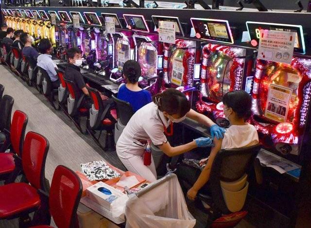 13일(현지시간) 일본 서부 오사카시의 한 파칭코 업소 안. 파칭코 핀볼 기계 앞에서 한 여성이 첫 번째 모더나 COVID-19 백신 주사를 맞고 있습니다. 국민오락시설인 이 곳까지 접종을 시도한 건 이례적입니다. 의료진들은 가까운 병원에서 파견됐습니다. 13~14일 이틀 동안 종업원들과 단골손님 등 1500명이 접종을 했습니다.