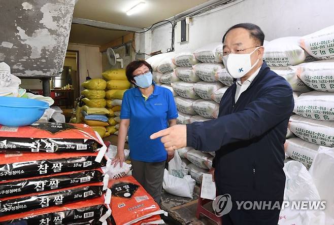 (서울=연합뉴스) 홍남기 경제부총리 겸 기획재정부 장관이 추석 연휴를 앞두고 14일 충남 아산시 소재 온양온천시장을 방문해 상인과 대화하고 있다. 2021.9.14