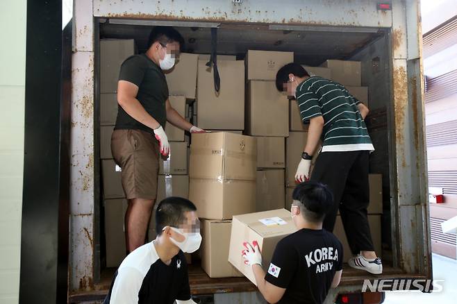 [강릉=뉴시스] 김경목 기자 = 14일 오후 강릉우체국 아르바이트 사원들이 강원 강릉시 모래네한과마을 선미한과(대표 김성래) 풀필먼트 센터에서 한과 포장박스를 트럭에 옮겨 쌓고 있다. 2021.09.14. photo31@newsis.com