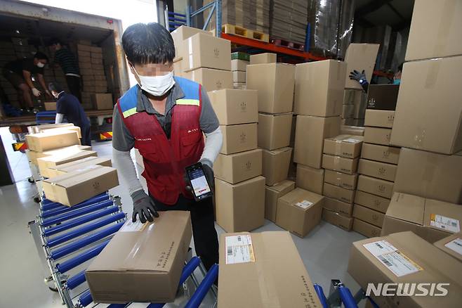 [강릉=뉴시스] 김경목 기자 = 14일 오후 강릉우체국 배송 담당자가 강원 강릉시 모래네한과마을 선미한과(대표 김성래) 풀필먼트 센터에서 한과 포장박스 운송장 바코드를 기계에 찍고 있다. 2021.09.14. photo31@newsis.com
