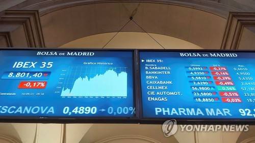 epa09466993 View of a screen with the Ibex 35, the main index of the Spanish Stock Exchange in Madrid, Spain on 14 September 2021. EPA/Altea Tejido