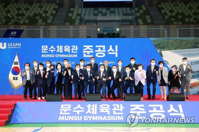 (울산=연합뉴스) 14일 울산 문수체육관에서 열린 준공식에서 송철호 울산시장, 박병석 울산시의회 의장, 노옥희 울산시 교육감, 이채익 국회의원 등 참석자들이 주먹을 쥐며 포즈를 취하고 있다. 2021.9.14 [울산시 제공. 재판매 및 DB 금지]