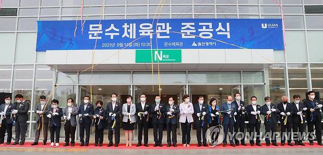 (울산=연합뉴스) 14일 울산 문수체육관에서 열린 준공식에서 송철호 울산시장, 박병석 울산시의회 의장, 노옥희 울산시 교육감, 이채익 국회의원 등이 기념 테이프를 자르고 있다. 2021.9.14 [울산시 제공. 재판매 및 DB 금지]