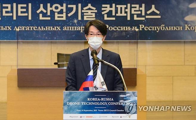 (서울=연합뉴스) 서가람 산업통상자원부 통상협력국장이 14일 오후 서울 대한상공회의소 의원회의실에서 열린 '한-러시아 모빌리티 산업기술 콘퍼런스'에 참석해 축사하고 있다. 2021.9.14