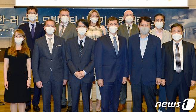 (서울=뉴스1) = 서가람 산업통상자원부 통상협력국장이 14일 오후 서울 중구 대한상공회의소 의원회의실에서 ‘미래 드론 모빌리티 혁신기술 발전 동향과 한-러 협력모델’이라는 주제로 열린 한-러시아 모빌리티 산업기술 컨퍼런스에서 한-러시아 양국 관계자들과 기념촬영을 하고 있다. (산업통상자원부 제공) 2021.9.14/뉴스1
