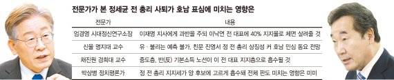 전문가들은 정 전 총리 사퇴가 오는 25~26일로 예정된 호남대첩에 미칠 파급력을 놓고 엇갈린 분석을 내놨다. 전통적으로 전략적 선택을 해온 호남 민심이 이번에도 초반 승기를 잡은 이 지사를 밀어줄 것이란 전망과 함께 유일한 호남후보인 이 전 대표에게 힘을 실어줘 역전의 발판을 마련할 것이라는 관측이 엇갈렸다.