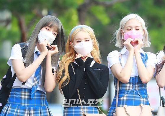 그룹 스테이씨의 윤,시은이 14일 오전 서울 여의도 KBS방송국에서 열리는 ‘열린음악회’ 녹화에 참석하며 포즈를 취하고 있다.